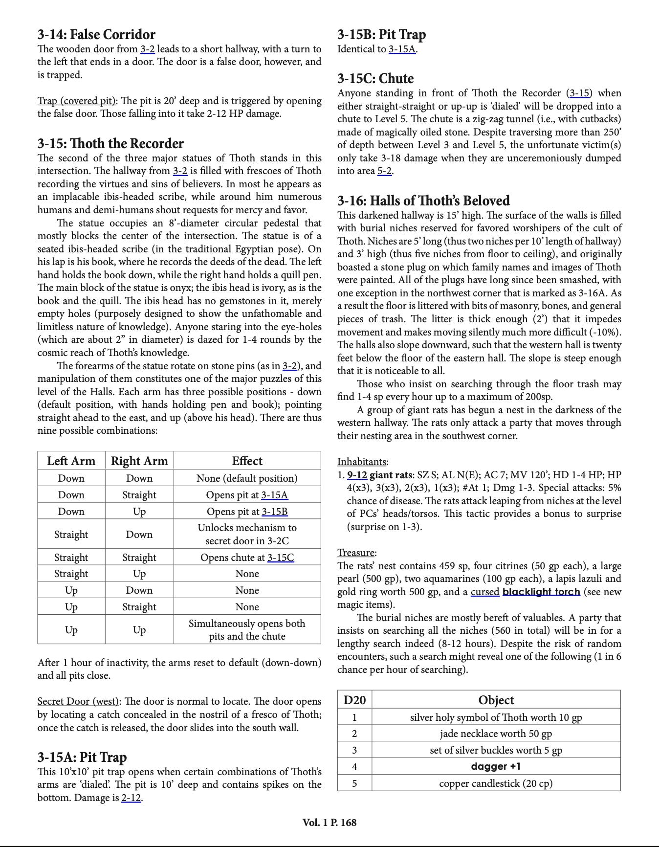 Thirty-two of the early priors were buried neatly in niches carved into the walls for this purpose. Each niche is 3’ deep and features a carved marble gisant of the prior; these priors vary by gender, size, racial features, and garb, although most feature the traditional cylindrical headdress of the priesthood of Thoth. Alas for tomb-robbers, most of the gisants do not contain any loot; in fact, only the last 10 of the gisants conceal cavities for bones and grave goods. It takes 2-4 turns of hard work with suitable tools to remove the lid of each gisant. The noise of such labor will prompt multiple random encounter checks (see 3-38). Sadly, the resulting finds are meager. Nine of the ten contain only bones and some minor jewelry (10-100 gp worth each). The tenth, of the 33rd prior (Yakon), contains a wand of lightning.