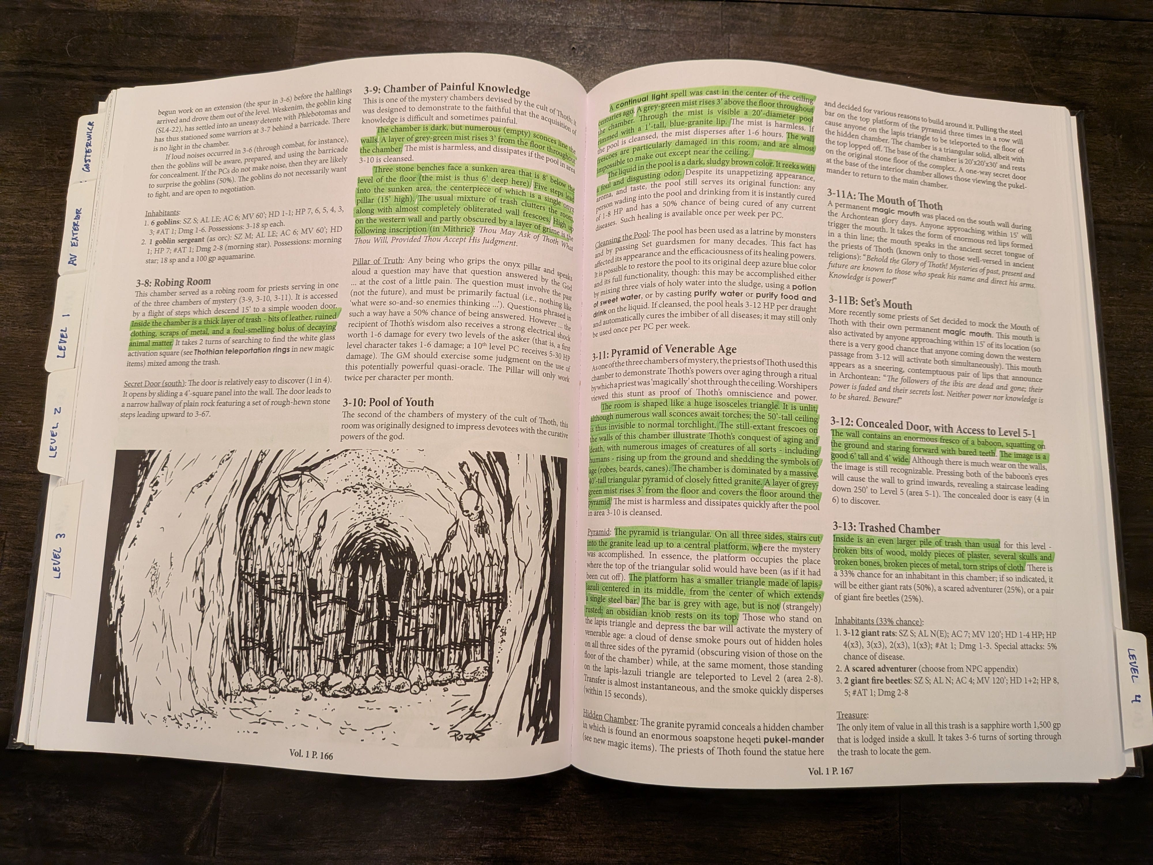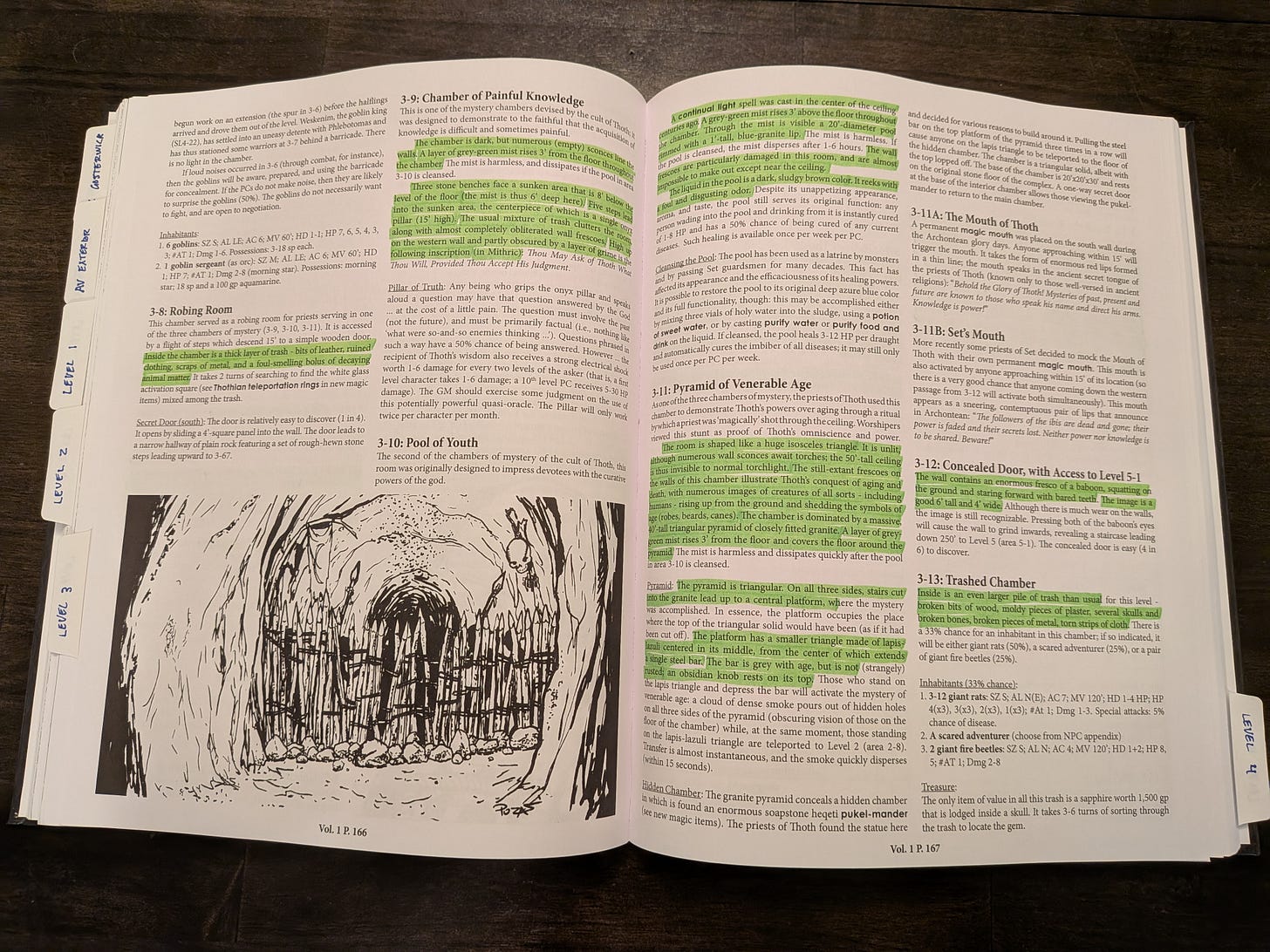 in a mere 1120 pages. The section containing the encounter descriptions and encounter tables runs ~800 pages long, so on average we’re looking at ~3 rooms per page. That’s good!