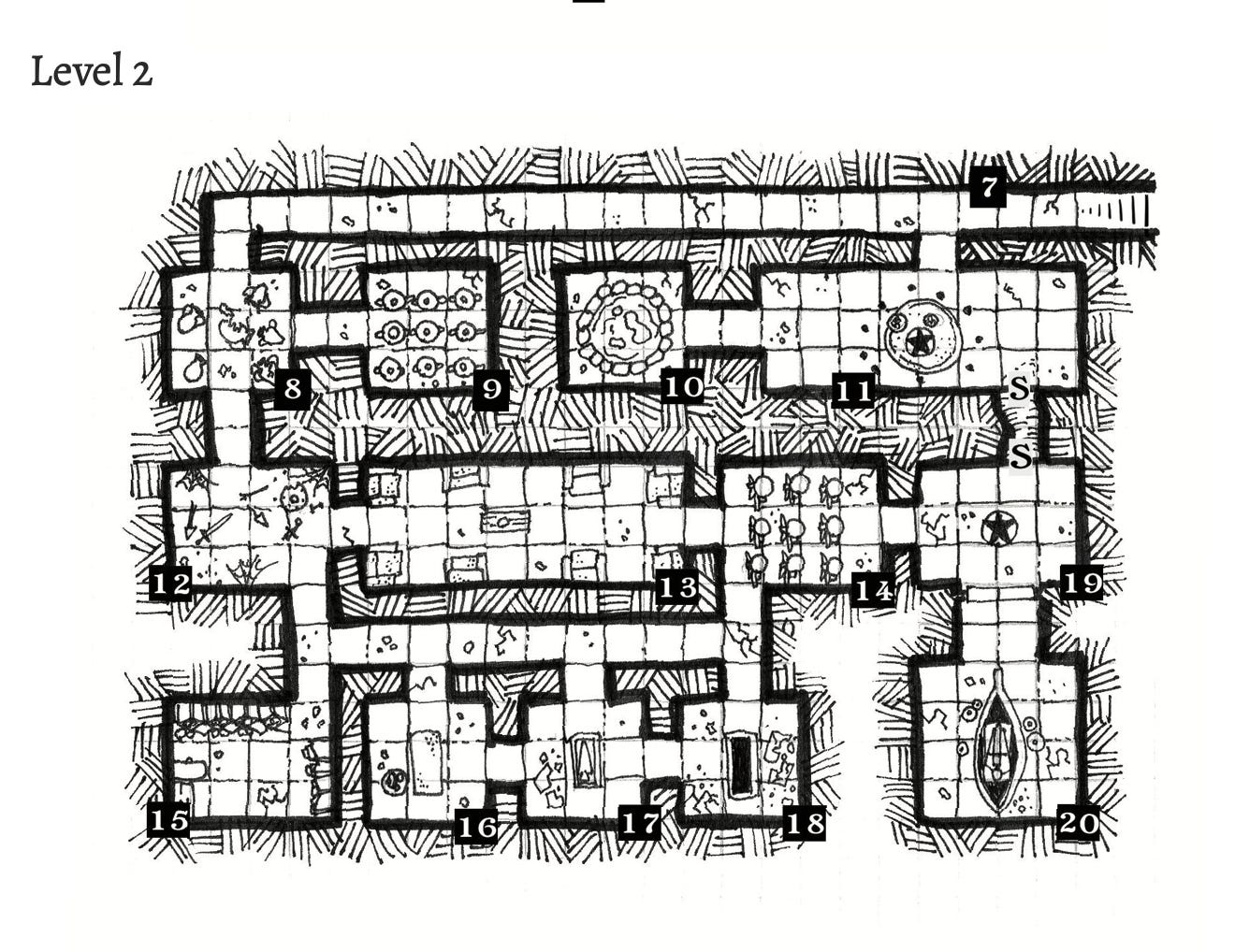 Cadaver Storage: Fresh humanoid corpses; linens & chemicals; rat-chewed door. Giant Rats (10). Under a flagstone are 3,000 sp & 2 gems (25 gp each). Kobolds store corpses here to trade with the Gentlemen Ghouls (see Level 4D). — Stonehell