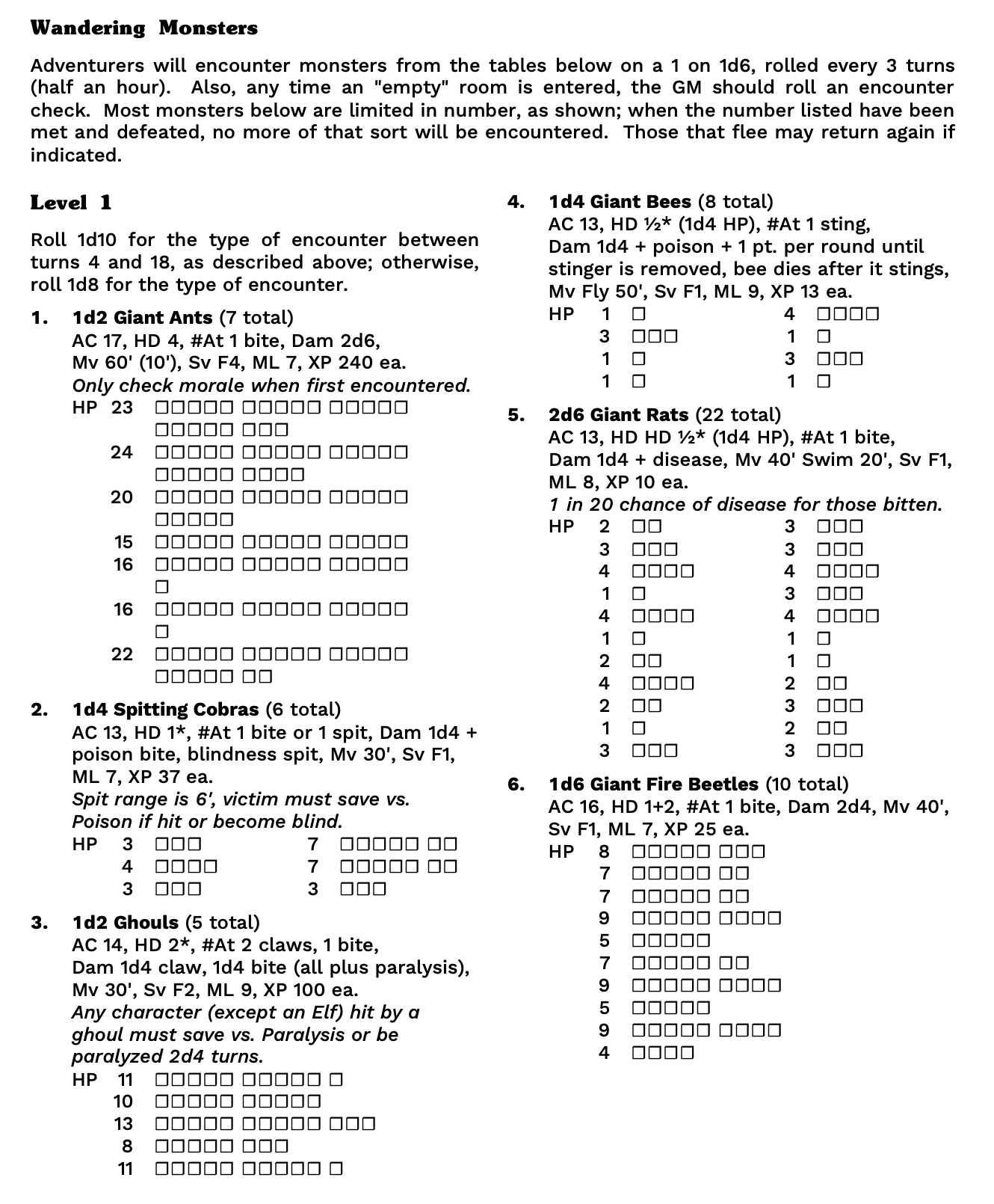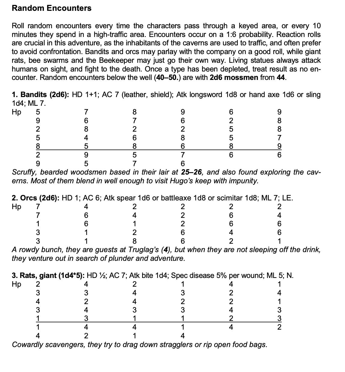 Don’t make me roll for the number of enemies in a room! If it’s a thing that exists in the world already, roll it ahead of time. If you write that a room has 1d6 goblins, you’ve created 6 separate universes: one where the room has 1 goblin, another where the room has a 2 goblins, etc. Why are you doing that? What design purpose does it serve?
