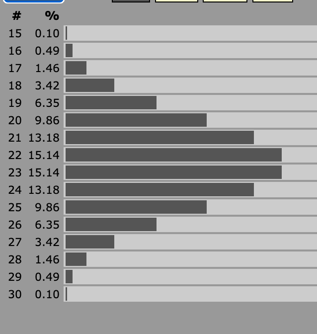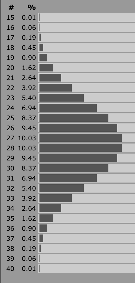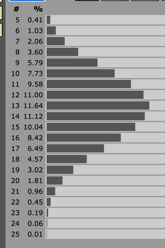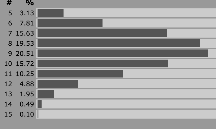 Impact: In BX, the difference between a 16 CON and 8 CON for a magic user is enormous. 16 CON gives +2 hp per level, whereas 8 CON gives -1. Here’s the HP distribution for a 5th level Magic User with 16 CON