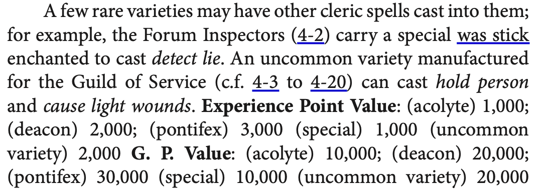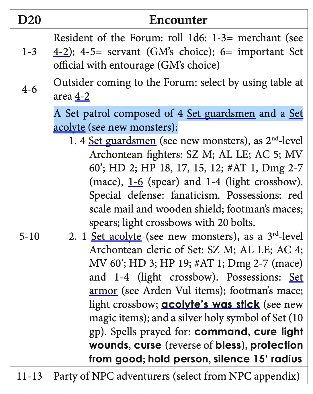 Set patrols are a pretty common wandering monster in Arden Vul; it’s 4x 2nd level fighters and a 3rd level cleric. The clerics all have a Acolyte’s Was Stick.