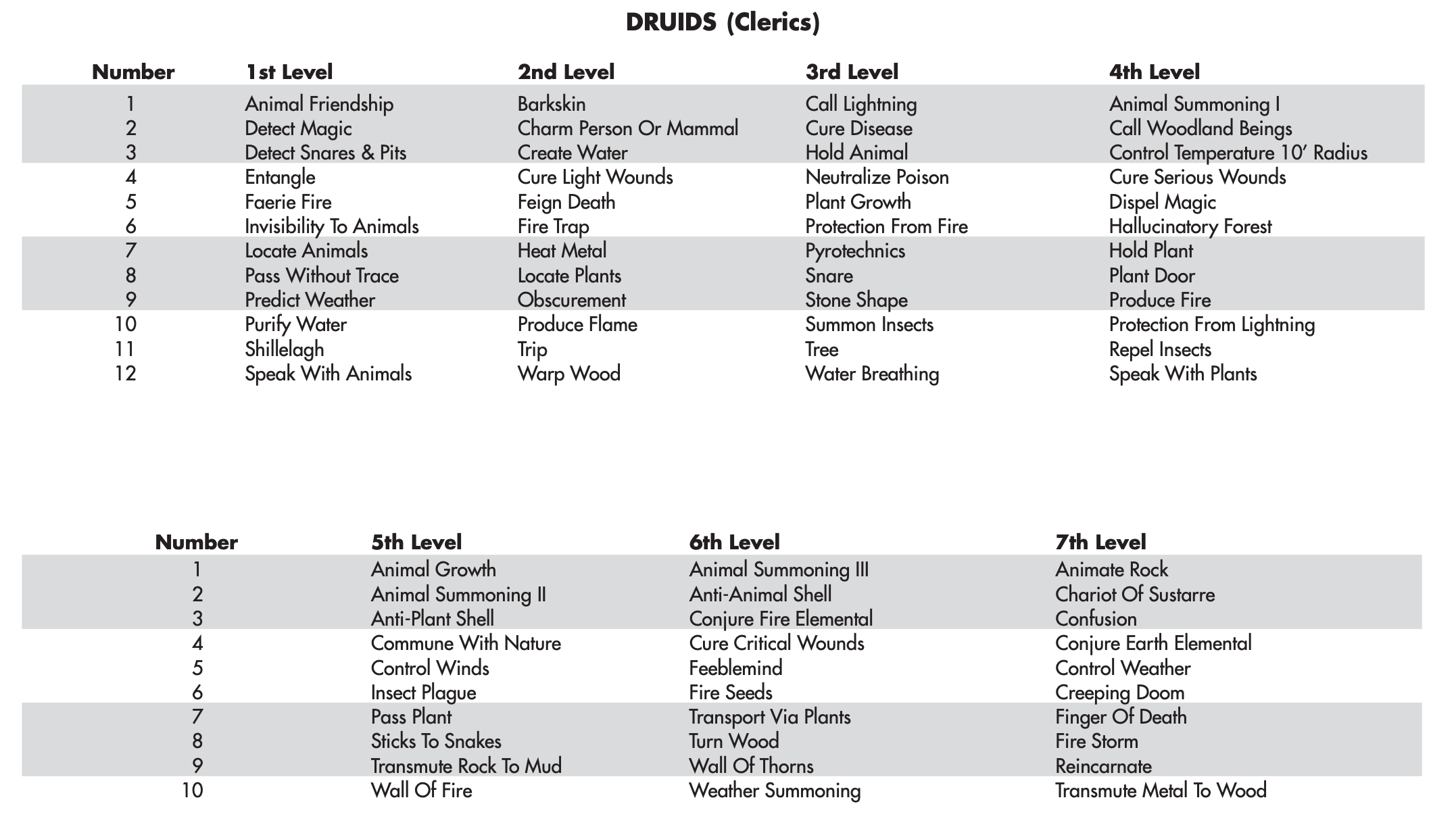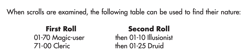 We roll 1d100 and get 95 so it’s a it’s either cleric or druid. We roll 1d100 again and get 16, so it’s for druids.