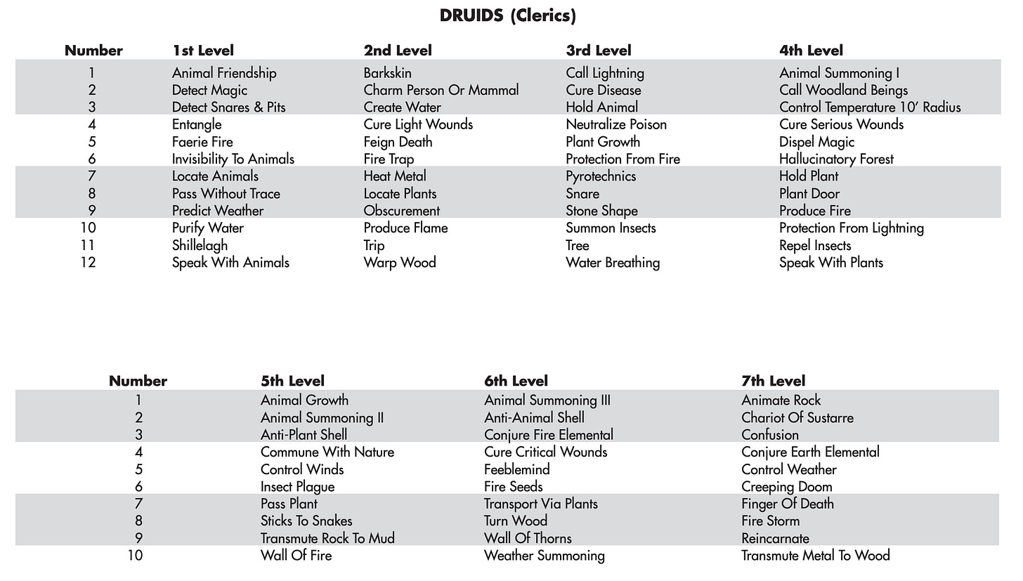 This spell will affect any single person or mammal it is cast upon. The creature then will regard the druid who cast the spell as a trusted friend and ally to be heeded and protected. The spell does not enable the druid to control the charmed creature as if it were an automaton, but any word or action of the druid will be viewed in its most favorable way. Thus, a charmed creature would not obey a suicide command, but might believe the druid if assured that the only chance to save the druid’s life is if the creature holds back an onrushing red dragon for “just a round or two”. Note also that the spell does not empower the druid with linguistic capabilities beyond those he or she normally possesses. The duration of the spell is a function of the charmed creature’s intelligence, and it is tied to the saving throw. The spell may be broken if a saving throw is made, and this saving throw is checked on a periodic basis according to the creature’s intelligence: [insert table]