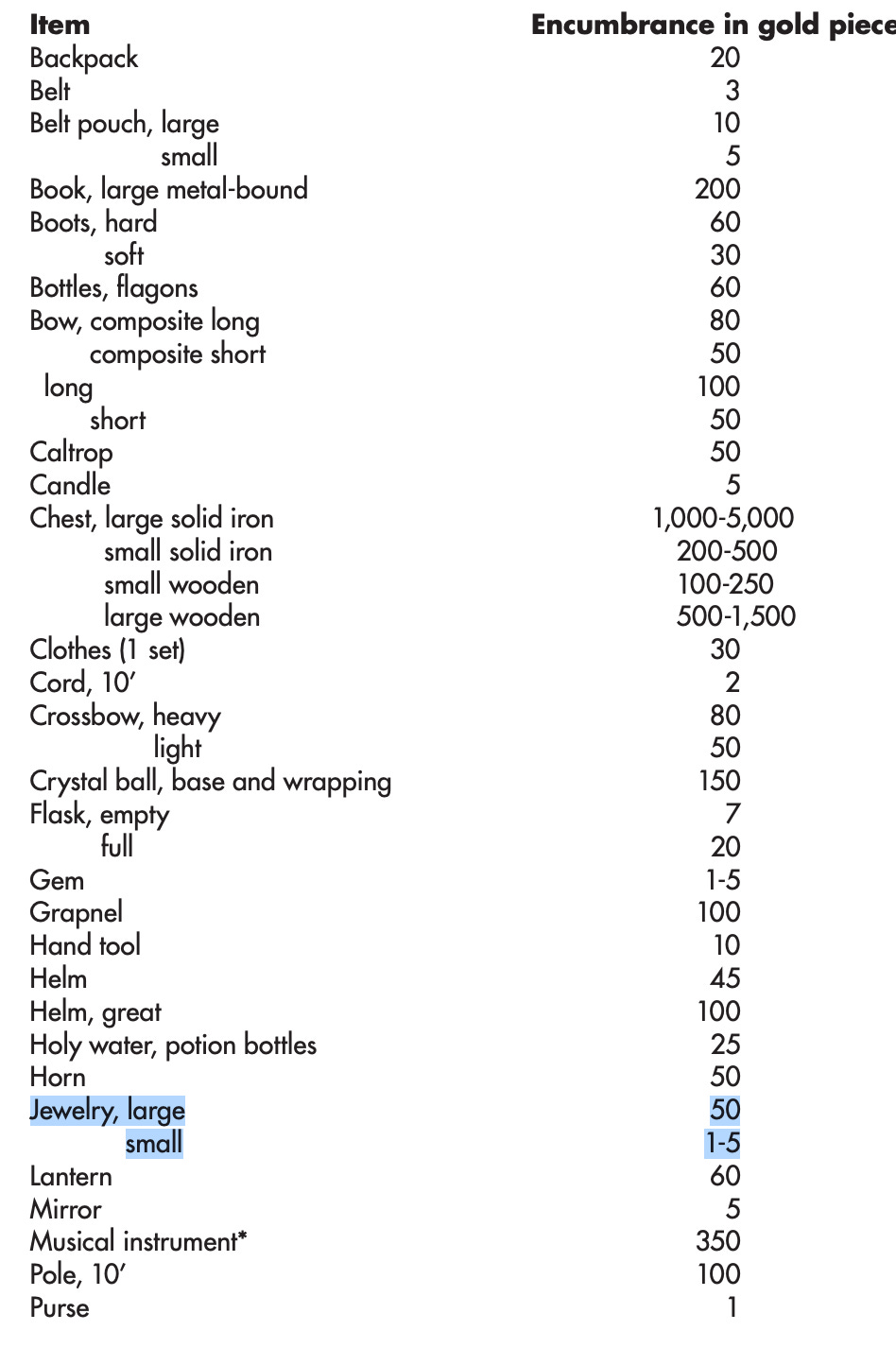 So small jewelry weighs 1d5/10lb and large jewelry weighs 5lb. We’re not told whether the jewelry is large or small and lord knows I dont want to roll 40 more dice to figure out how much this weighs. OSE gives that each piece of jewelry weighs 1lb, which is nice and simple to use, so let’s go with 40lb worth of jewelry.